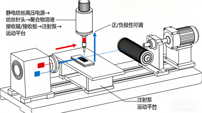 Electrospinning produces nanofibers from polymer solutions under high electrostatic fields for research on medical dressings, battery separators, filter materials, catalytic materials and functional composites in material and chemical engineering universities.