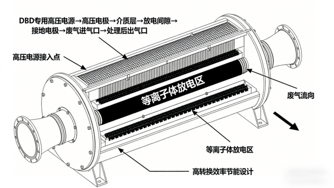 DBD cold plasma decomposes VOCs, hydrogen sulfide and ammonia for industrial waste gas treatment and ozone generation for water disinfection in coating, printing and chemical industries.