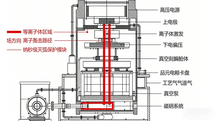 Plasma etching is the core patterning process for advanced processes below 28nm, divided into CCP capacitive coupled etching for high aspect ratio dielectric etching and ICP inductive coupled etching for low-damage silicon / metal etching. It realizes nano-scale pattern transfer by physical bombardment and chemical reaction for logic chips and 3D NAND storage.